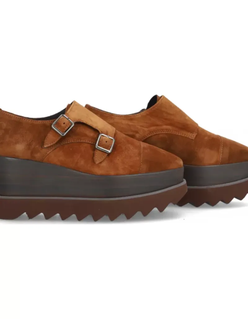 Zapato Para Mujer Alpe London, Fabricado En Piel (Piel) De Color Cuero Sin Tacon, Suela Antideslizante Y Puntera Redonda, Con Cierre Mediante Hebilla.