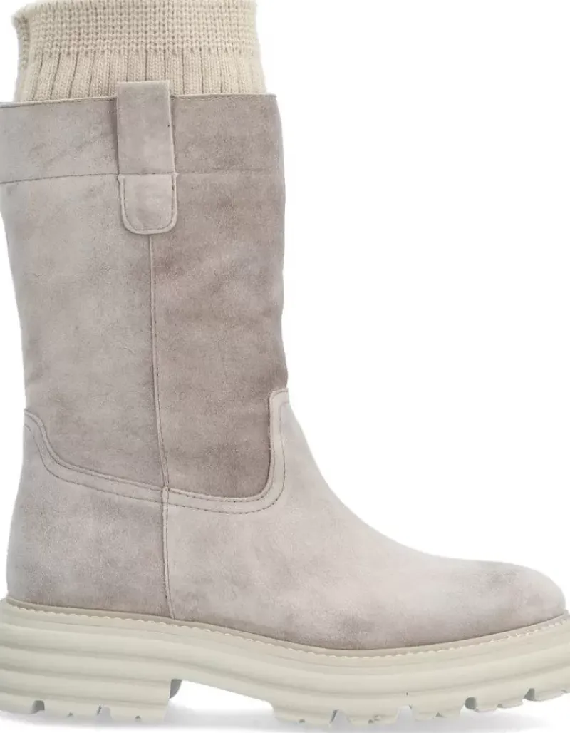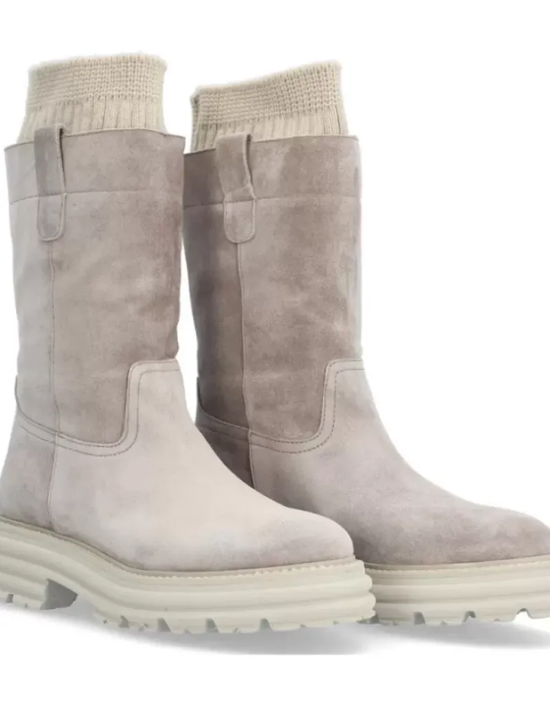 Bota Para Mujer Alpe Alabama, Fabricada En Piel (Baby Silk) De Color Taupe Con Tacon De 5 Cm, Suela Antideslizante Y Puntera Redonda, Sin Cierre Y Cana Media.
