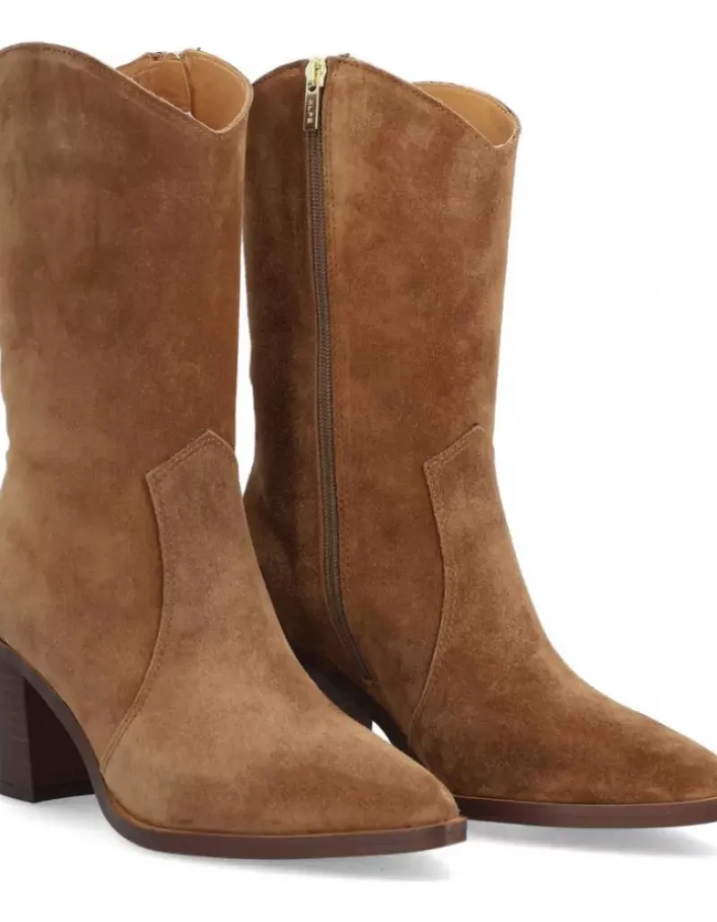 Bota Para Femme Alpe Alina, Fabricada En Piel (Baby Silk) De Color Cuero Con Tacon De 6,5 Cm, Suela Antideslizante Y Puntera Afilada, Con Cierre Mediante Cremallera Y Cana Media.