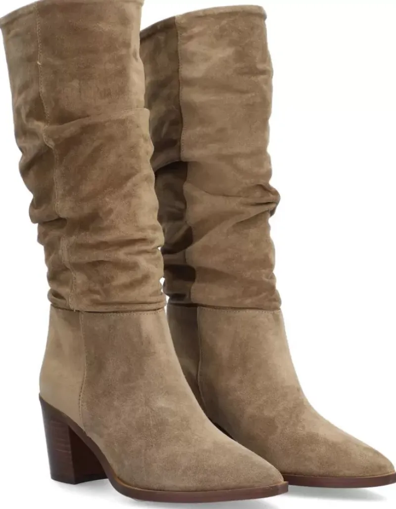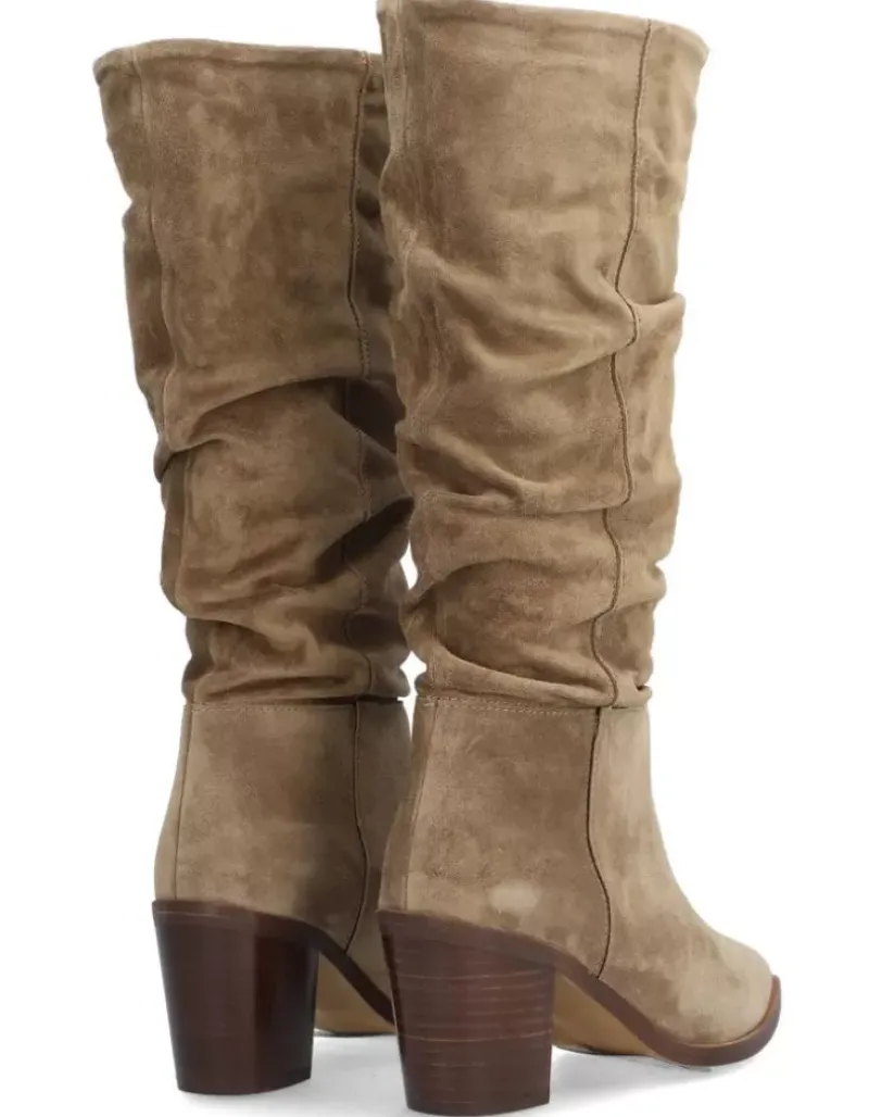 Bota Para Femme Alpe Alina, Fabricada En Piel (Baby Silk) De Color Sander Con Tacon De 6,5 Cm, Suela Antideslizante Y Puntera Afilada, Sin Cierre Y Cana Alta.