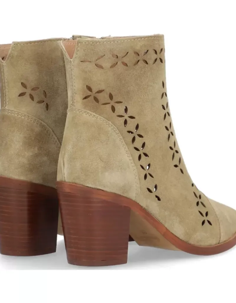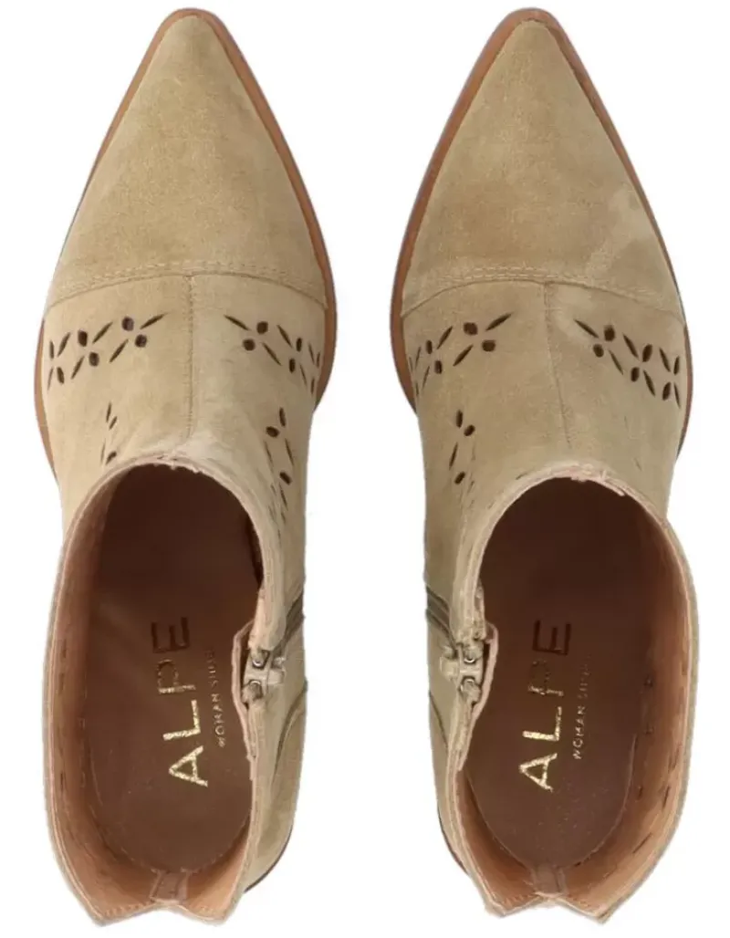 Botin Para Femme Alpe Alina, Fabricado En Piel (Baby Silk) De Color Tabaco Con Tacon De 6,5 Cm, Suela Antideslizante Y Puntera Afilada, Con Cierre Mediante Cremallera Y Cana Baja.