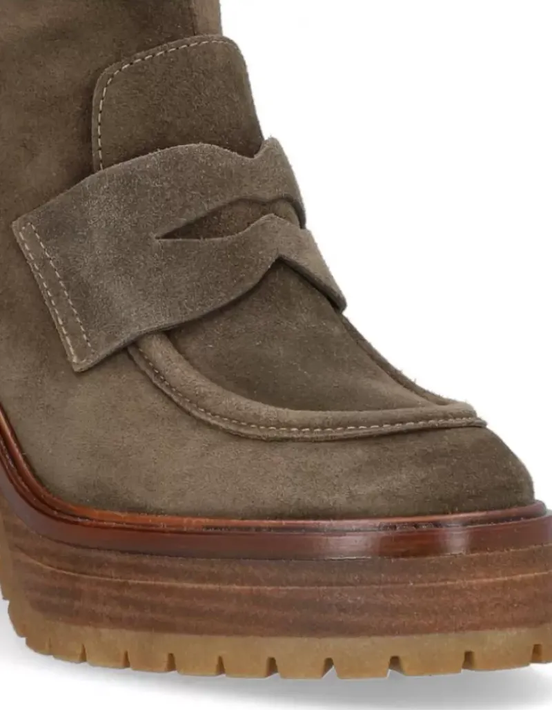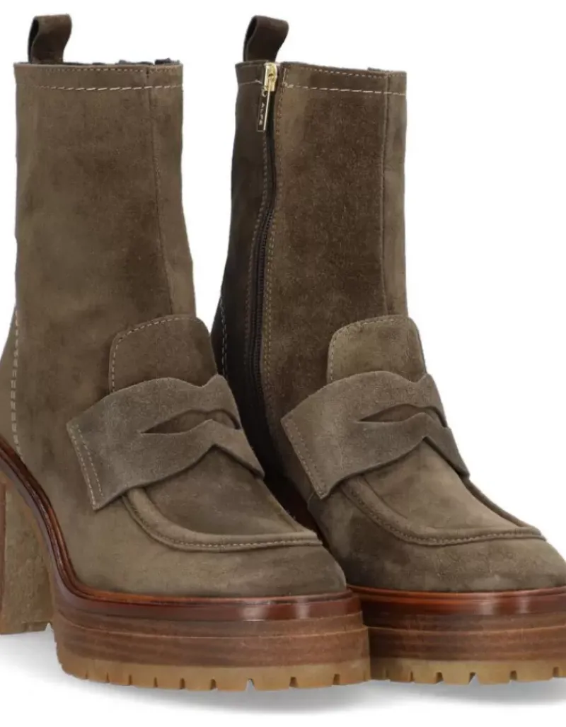 Botin Para Femme Alpe Anima, Fabricado En Piel (Baby Silk) De Color Olive Con Tacon De 8,5 Cm, Suela Antideslizante Y Puntera Redonda, Con Cierre Mediante Cremallera Y Cana Baja.
