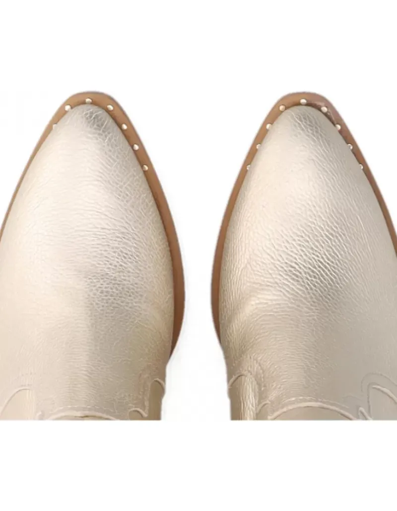 Botin Para Femme Alpe Claire, Fabricado En Piel (Gibson) De Color Platino Con Tacon De 5 Cm, Suela Antideslizante Y Puntera Afilada, Con Cierre Mediante Cremallera Y Cana Baja.
