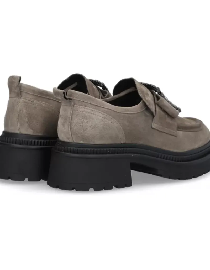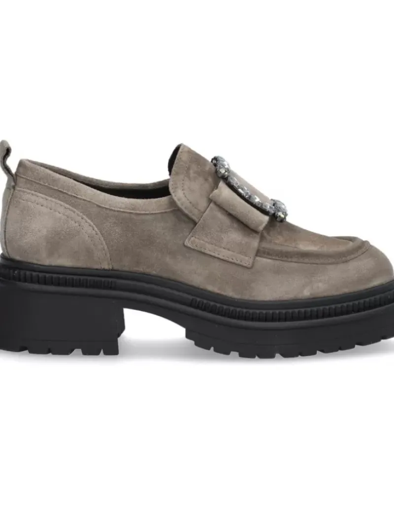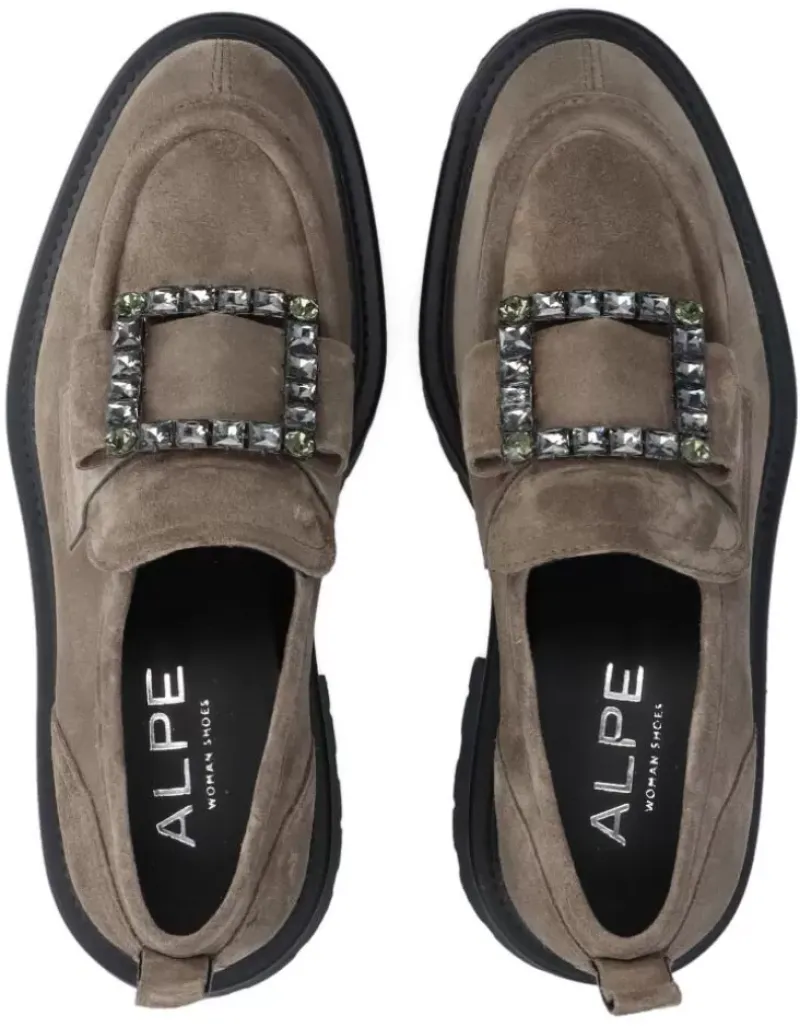 Zapato Para Femme Alpe Clay, Fabricado En Piel (Baby Silk) De Color Taiga Con Tacon De 5 Cm, Suela Antideslizante Y Puntera Redonda, Sin Cierre.