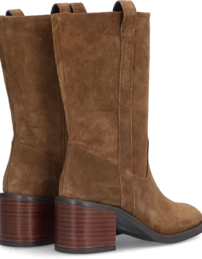 Bota Para Mujer Alpe Covent, Fabricada En Piel (Baby Silk) De Color Sandalo Con Tacon De 6,5 Cm, Suela Antideslizante Y Puntera Redonda, Sin Cierre Y Cana Media.