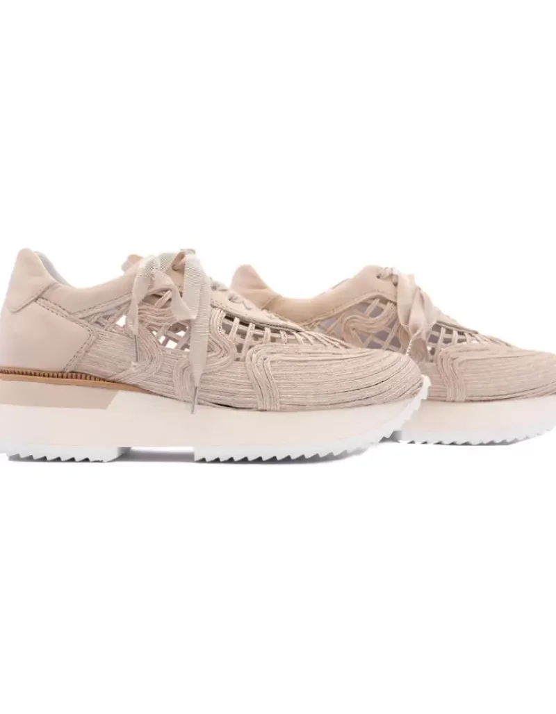 Sneaker Deportivo Para Mujer Alpe Estella, Fabricado En Piel (Rafia) De Color Arena Sin Tacon, Suela Antideslizante Y Puntera Redonda, Con Cierre Mediante Cordon.
