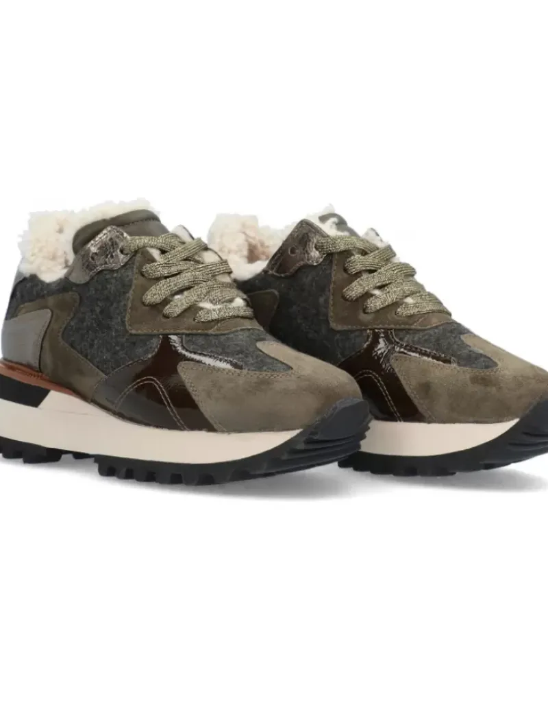 Sneaker Deportivo Para Mujer Alpe Estella, Fabricado En Piel (Franela) De Color Kaki Con Cuna De 5 Cm, Suela Antideslizante Y Puntera Redonda, Con Cierre Mediante Cordon.
