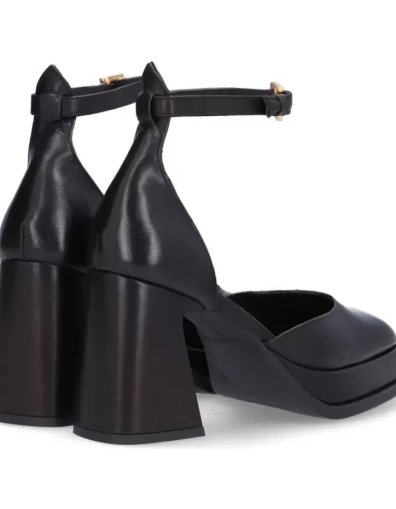 Zapato Para Femme Alpe Idanna, Fabricado En Piel (Becerro) De Color Negro Con Tacon De 8,5 Cm, Suela Antideslizante Y Puntera Cuadrada, Con Cierre Mediante Hebilla.