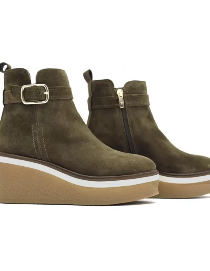 Botin Para Mujer Alpe Kiara, Fabricado En Piel (Baby Silk) De Color Olive Sin Tacon, Suela Antideslizante Y Puntera Redonda, Con Cierre Mediante Cremallera Y Cana Baja.