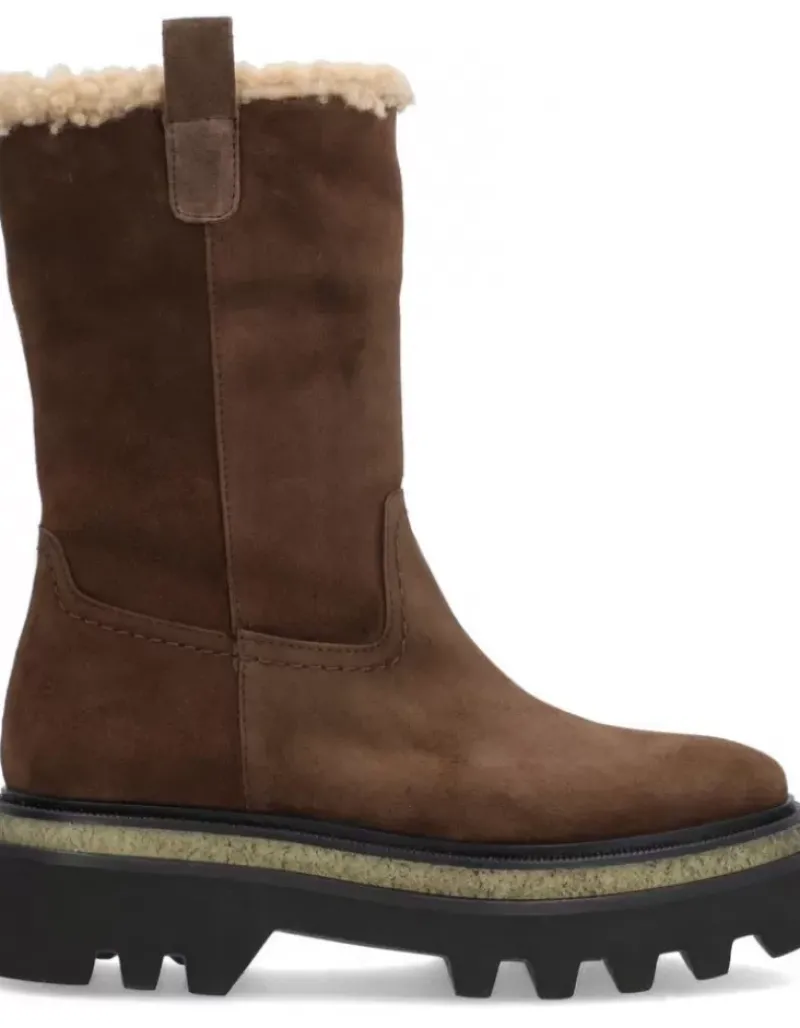 Bota Para Femme Alpe Milano, Fabricada En Piel (Baby Silk) De Color Arabica Con Tacon De 5 Cm, Suela Antideslizante Y Puntera Redonda, Sin Cierre Y Cana Media.