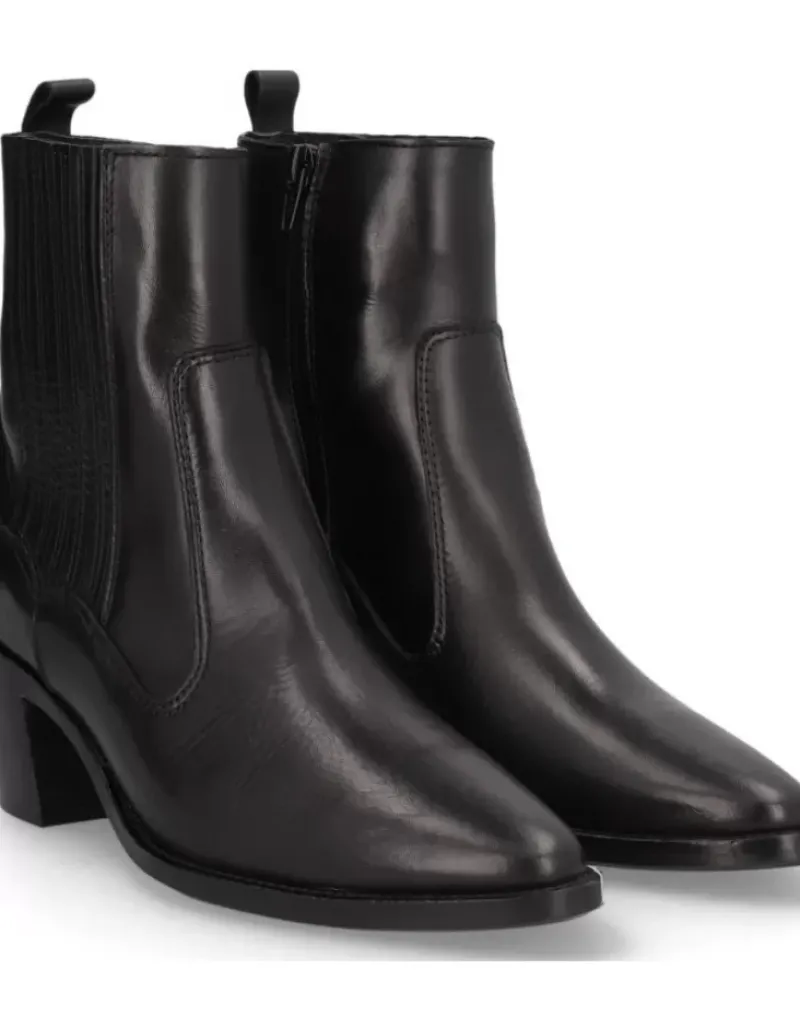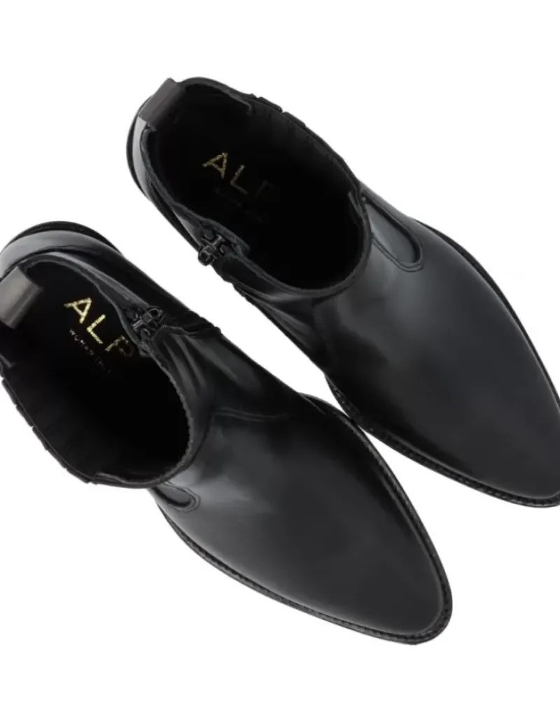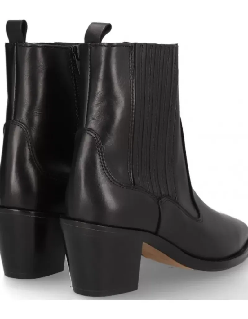 Botin Para Femme Alpe Nevada, Fabricado En Piel (Becerro) De Color Negro Con Tacon De 5,5 Cm, Suela Antideslizante Y Puntera Afilada, Con Cierre Mediante Cremallera Y Cana Baja.