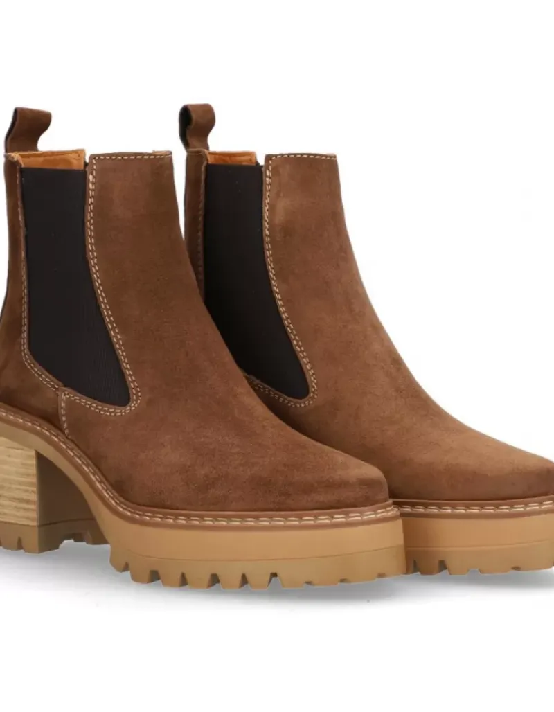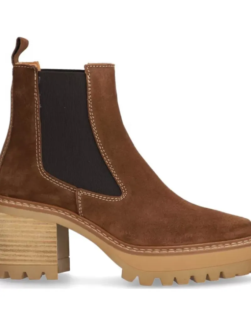 Botin Para Femme Alpe New Amelie, Fabricado En Piel (Baby Silk) De Color Castaa Con Tacon De 7 Cm, Suela Antideslizante Y Puntera Redonda, Sin Cierre Y Cana Baja.