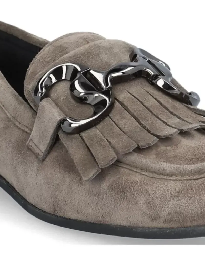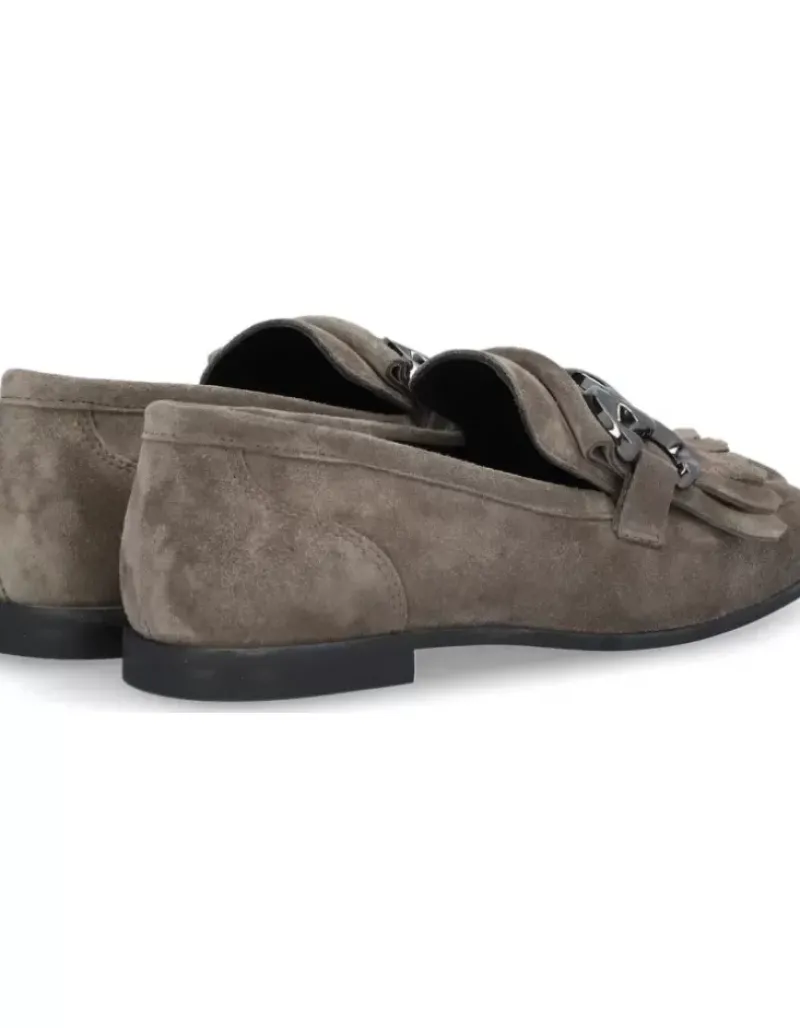Mocasin Para Femme Alpe New Roma, Fabricado En Piel (Baby Silk) De Color Taiga Con Tacon De 1 Cm, Suela Antideslizante Y Puntera Cuadrada, Sin Cierre.