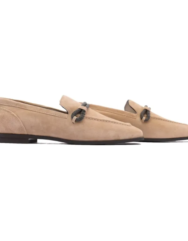 Mocasin Para Mujer Alpe New Roma, Fabricado En Piel (Baby Silk) De Color Arena Con Sin Tacon De 1 Cm, Suela Antideslizante Y Puntera Cuadrada, Sin Cierre.