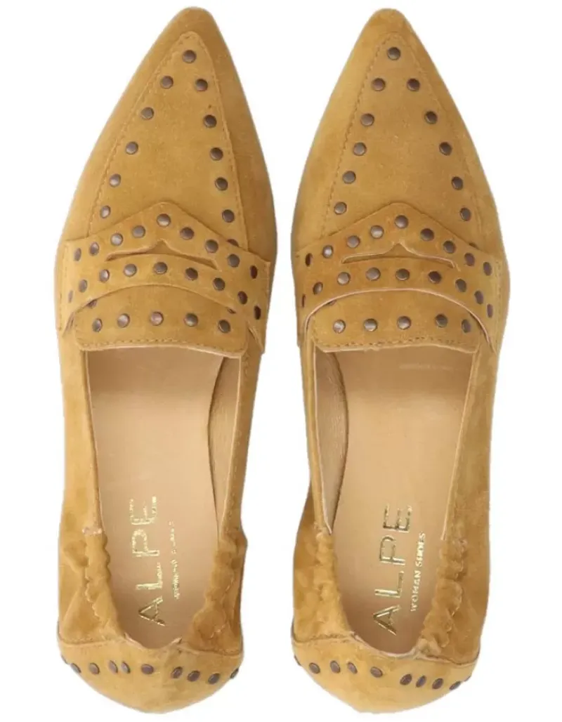 Mocasin Para Femme Alpe Niza, Fabricado En Piel (Baby Silk) De Color Senape Con Tacon De 1 Cm, Suela Antideslizante Y Puntera Afilada, Sin Cierre.