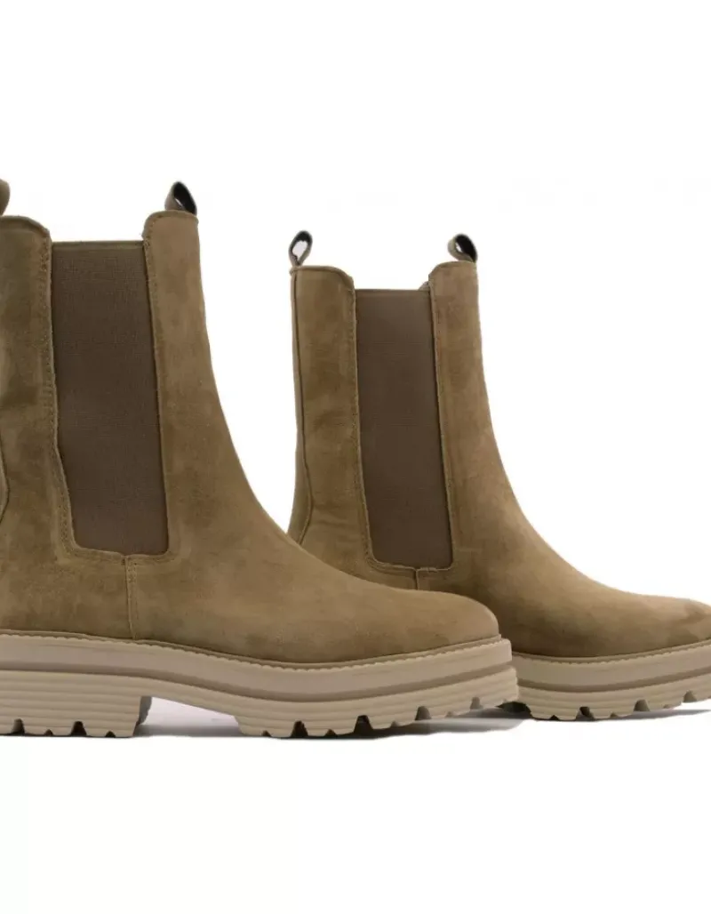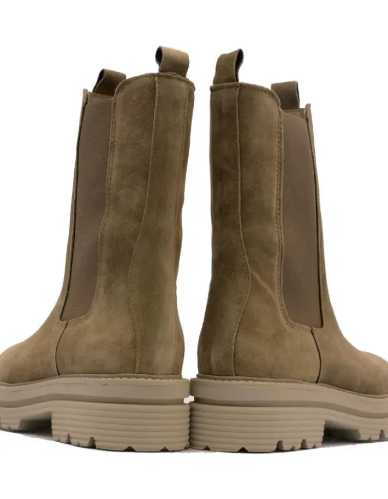Bota Para Mujer Alpe Oslo, Fabricada En Piel (Baby Silk) De Color Kaki Con Tacon De 4,5 Cm, Suela Antideslizante Y Puntera Redonda, Sin Cierre Y Cana Media.