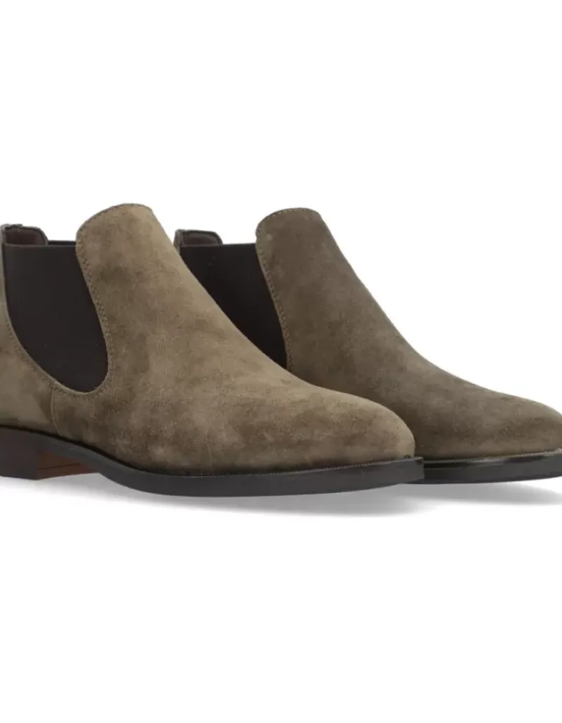 Botin Para Femme Alpe Parker, Fabricado En Piel (Baby Silk) De Color Kaki Con Tacon De 6 Cm, Suela Antideslizante Y Puntera Redonda, Sin Cierre Y Cana Baja.