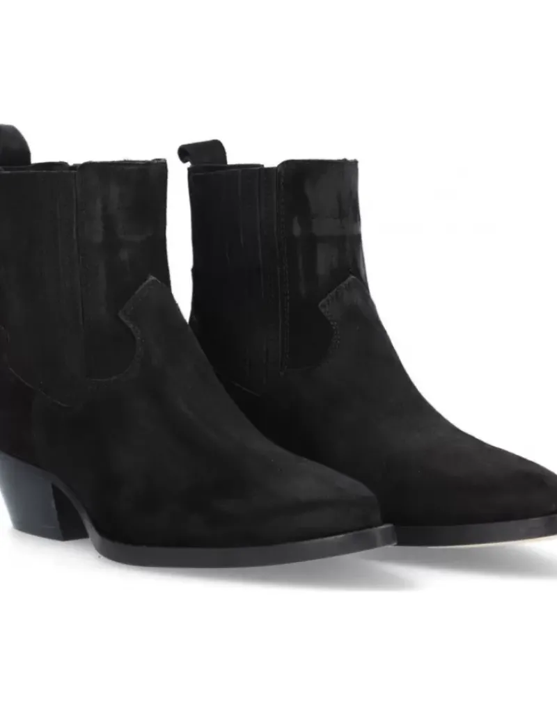 Botin Para Femme Alpe Western, Fabricado En Piel (Baby Silk) De Color Negro Con Tacon De 4,5 Cm, Suela Antideslizante Y Puntera Afilada, Sin Cierre Y Cana Baja.