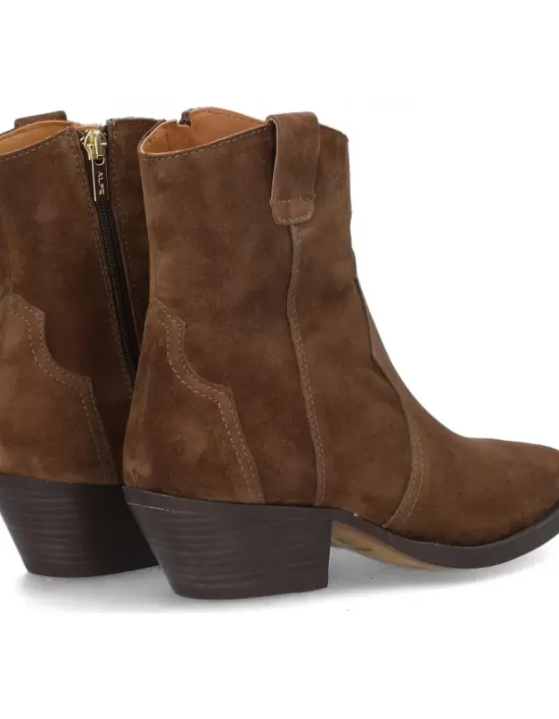 Botin Para Femme Alpe Western, Fabricado En Piel (Baby Silk) De Color Castaa Con Tacon De 4,5 Cm, Suela Antideslizante Y Puntera Afilada, Con Cierre Mediante Cremallera Y Cana Baja.