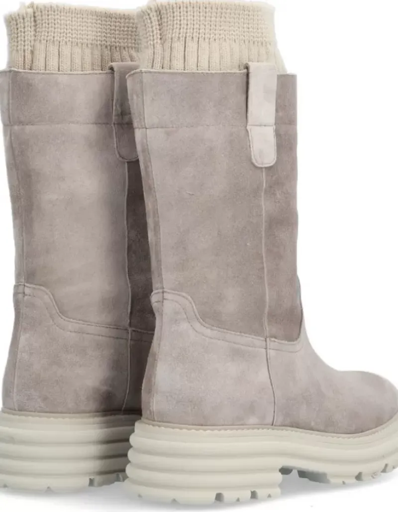 Bota Para Mujer Alpe Alabama, Fabricada En Piel (Baby Silk) De Color Taupe Con Tacon De 5 Cm, Suela Antideslizante Y Puntera Redonda, Sin Cierre Y Cana Media.