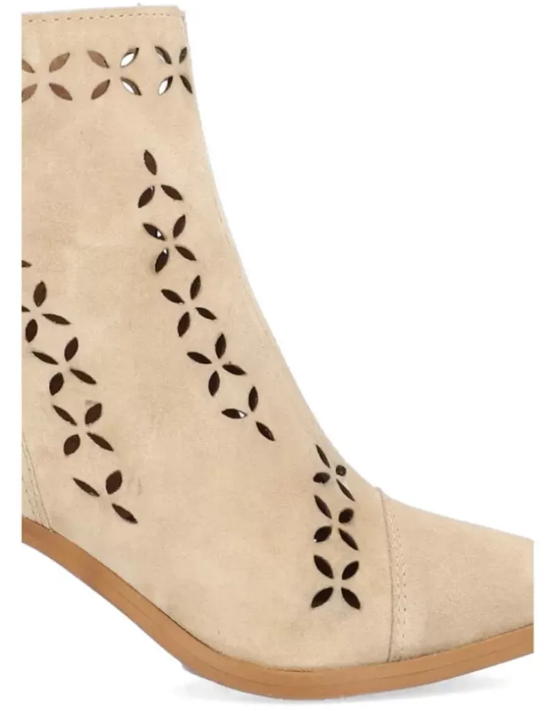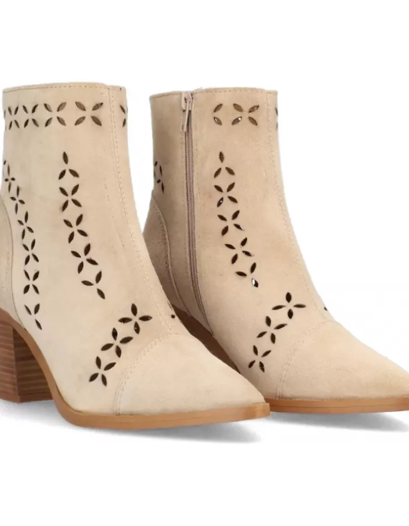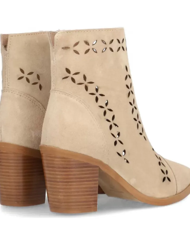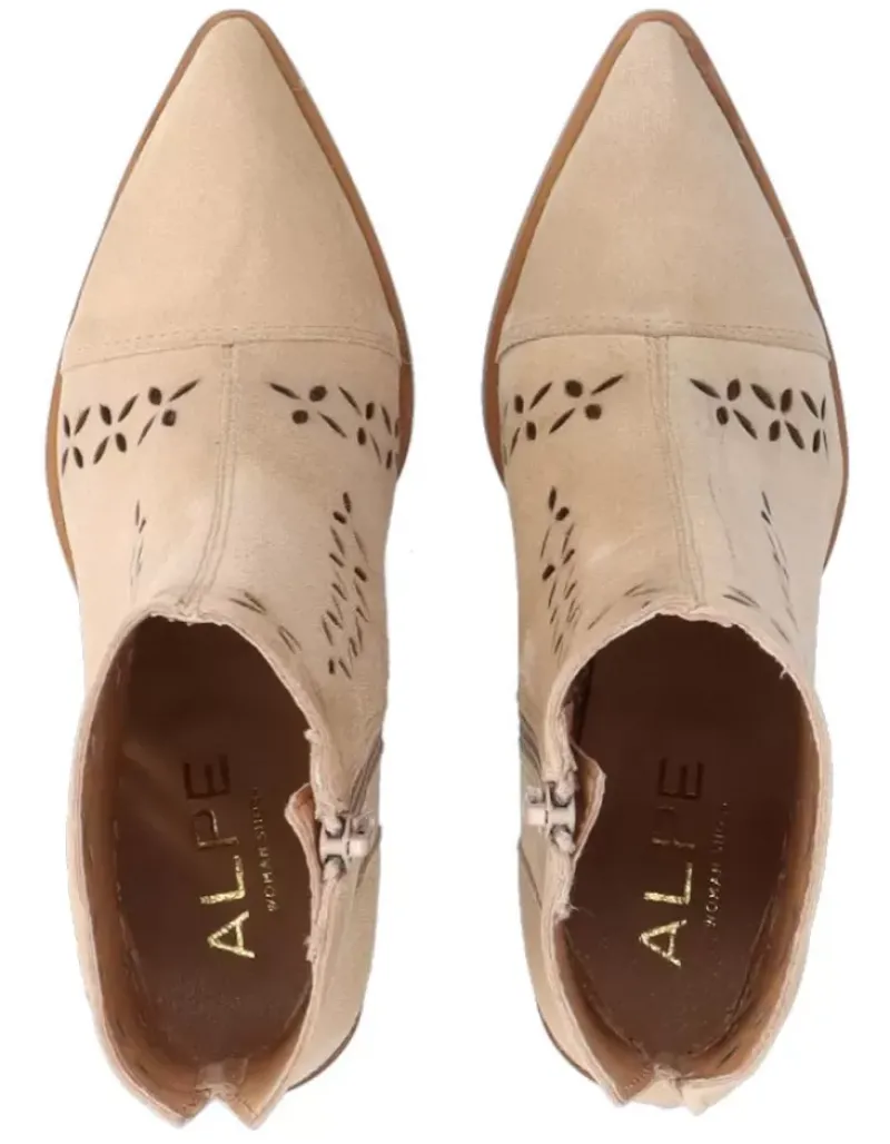 Botin Para Femme Alpe Alina, Fabricado En Piel (Baby Silk) De Color Arena Con Tacon De 6,5 Cm, Suela Antideslizante Y Puntera Afilada, Con Cierre Mediante Cremallera Y Cana Baja.