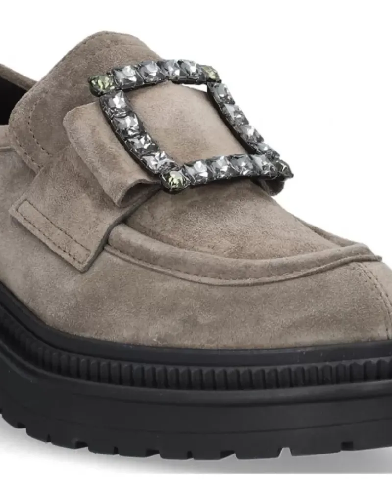 Zapato Para Femme Alpe Clay, Fabricado En Piel (Baby Silk) De Color Taiga Con Tacon De 5 Cm, Suela Antideslizante Y Puntera Redonda, Sin Cierre.