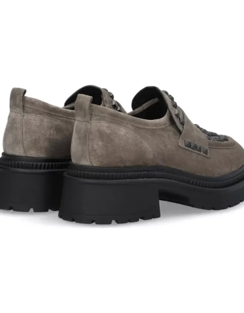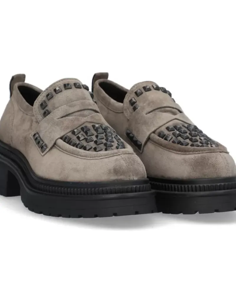 Zapato Para Femme Alpe Clay, Fabricado En Piel (Baby Silk) De Color Taiga Con Tacon De 5 Cm, Suela Antideslizante Y Puntera Redonda, Sin Cierre.