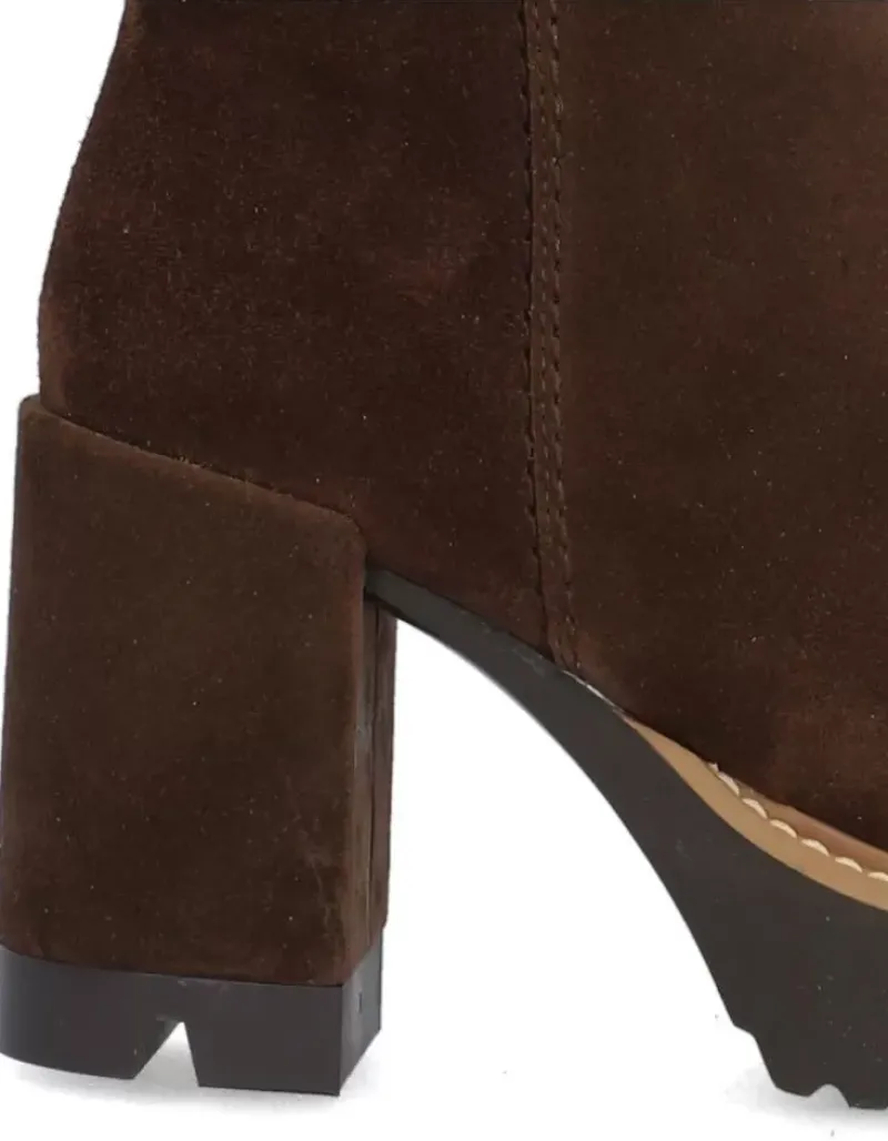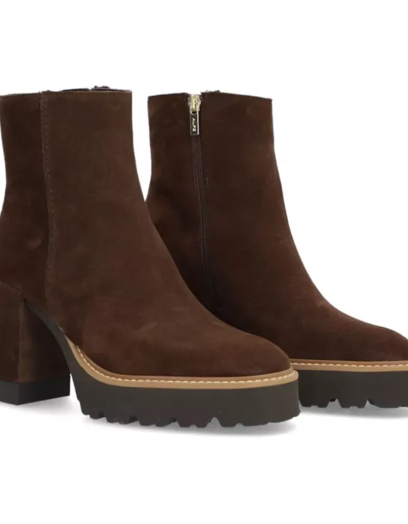 Botin Para Femme Alpe Colette, Fabricado En Piel (Baby Silk) De Color Arabica Con Tacon De 7 Cm, Suela Antideslizante Y Puntera Redonda, Con Cierre Mediante Cremallera Baja.