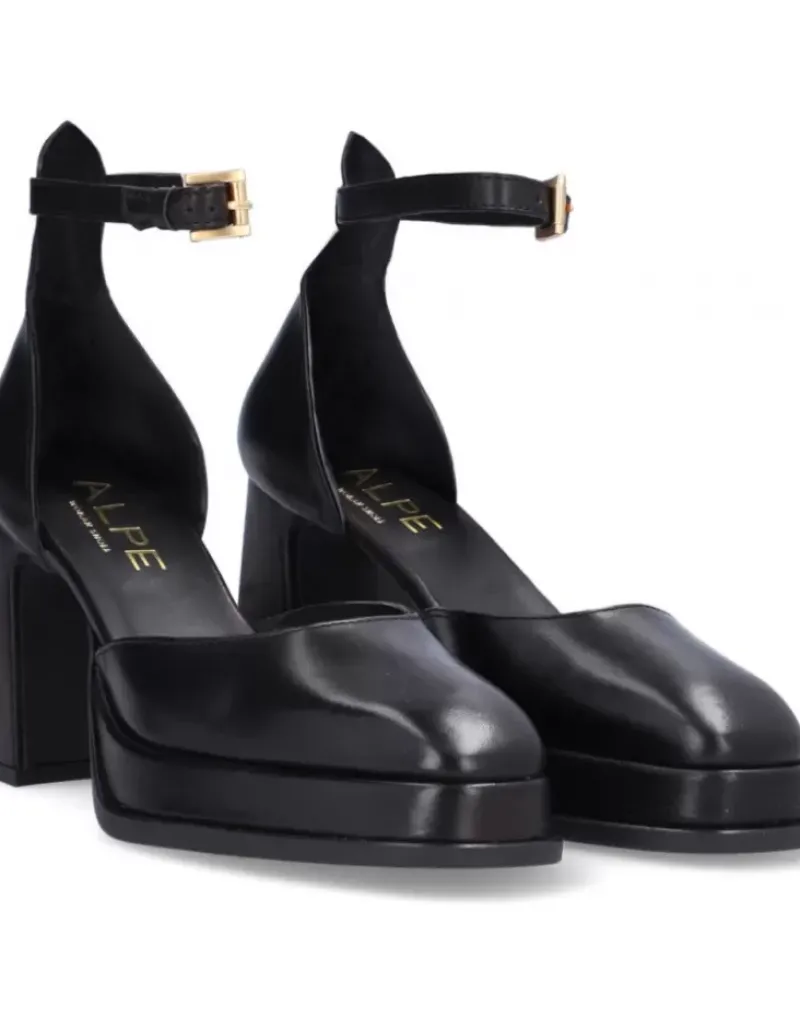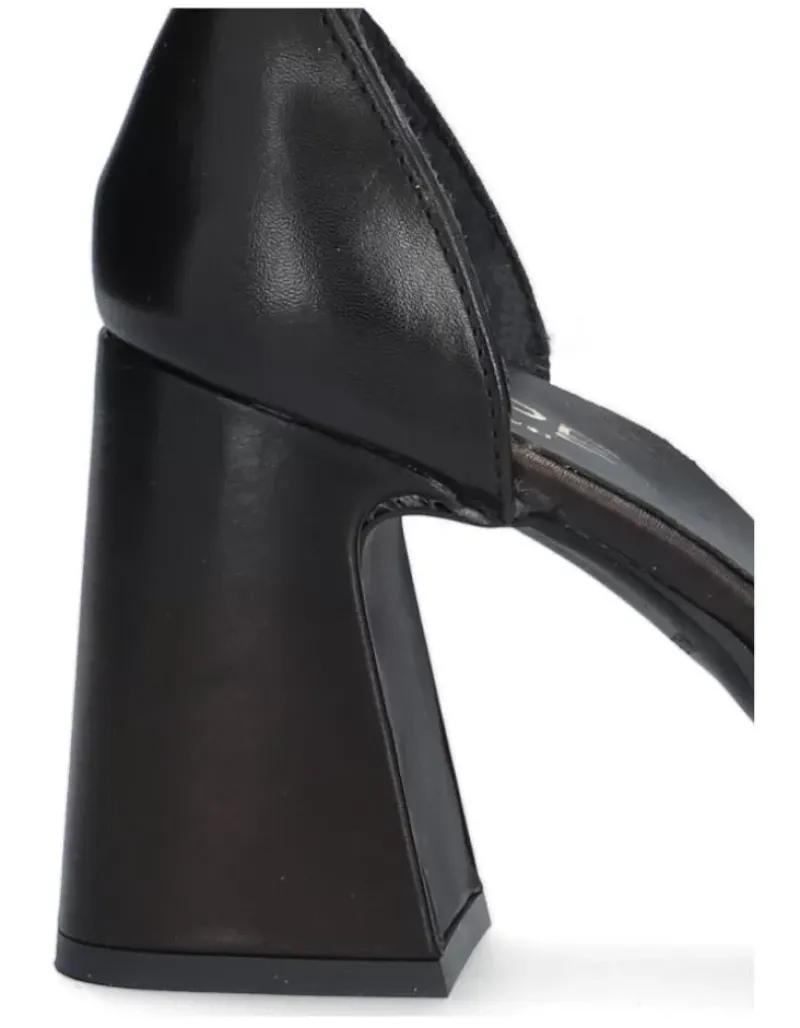 Zapato Para Femme Alpe Idanna, Fabricado En Piel (Becerro) De Color Negro Con Tacon De 8,5 Cm, Suela Antideslizante Y Puntera Cuadrada, Con Cierre Mediante Hebilla.