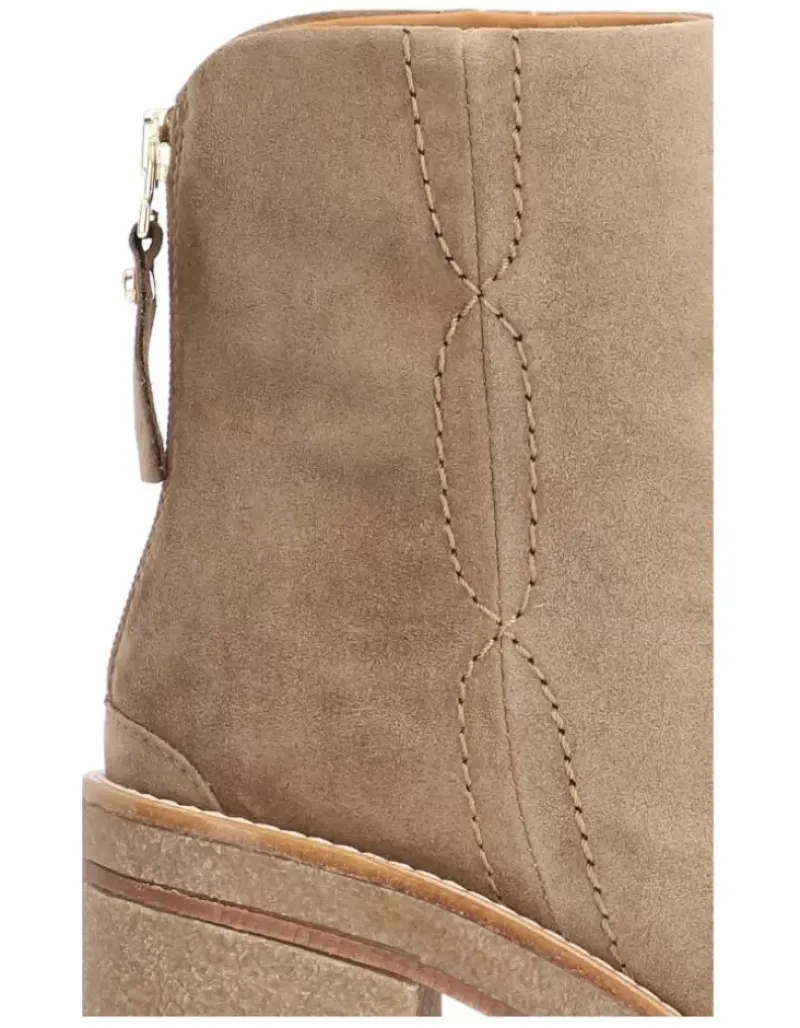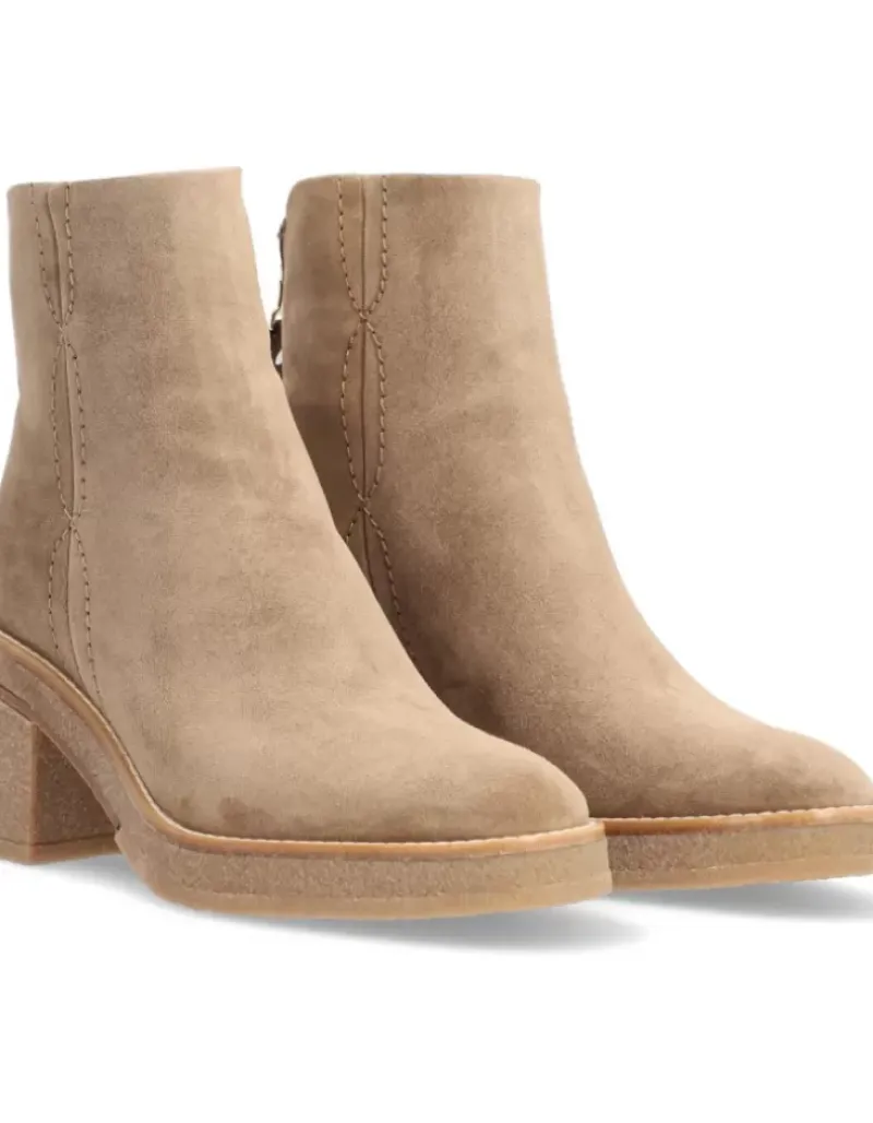 Botin Para Femme Alpe Janis, Fabricado En Piel (Baby Silk) De Color Sander Con Tacon De 7,5 Cm, Suela Antideslizante Y Puntera Redonda, Con Cierre Mediante Cremallera Baja.