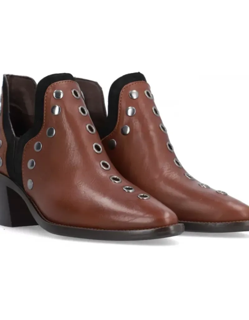 Botin Para Femme Alpe Nevada, Fabricado En Piel (Becerro) De Color Brandy Con Tacon De 6 Cm, Suela Antideslizante Y Puntera Afilada, Sin Cierre Y Cana Baja.