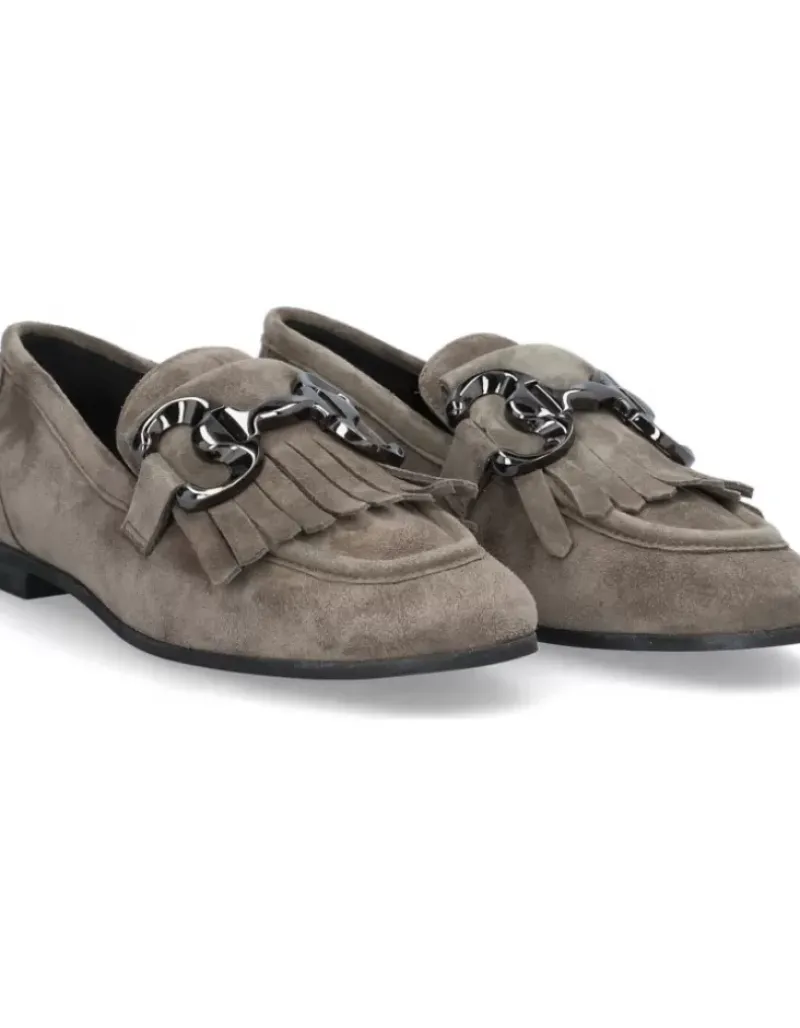 Mocasin Para Femme Alpe New Roma, Fabricado En Piel (Baby Silk) De Color Taiga Con Tacon De 1 Cm, Suela Antideslizante Y Puntera Cuadrada, Sin Cierre.
