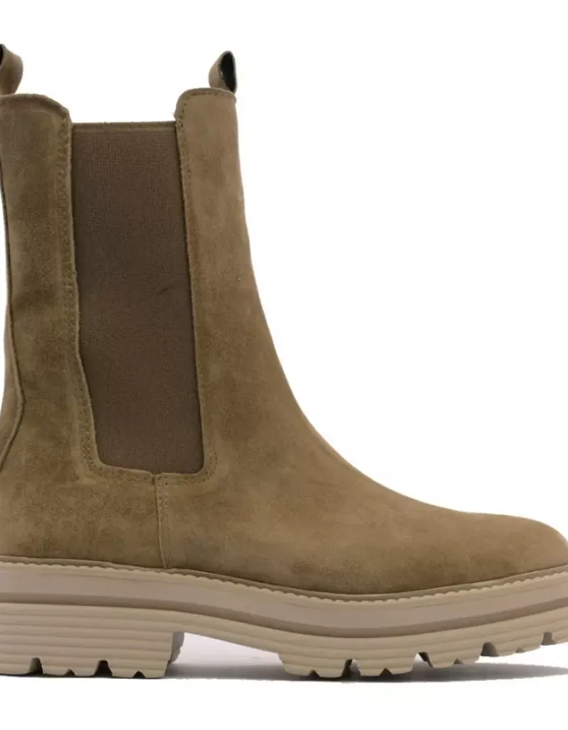 Bota Para Mujer Alpe Oslo, Fabricada En Piel (Baby Silk) De Color Kaki Con Tacon De 4,5 Cm, Suela Antideslizante Y Puntera Redonda, Sin Cierre Y Cana Media.