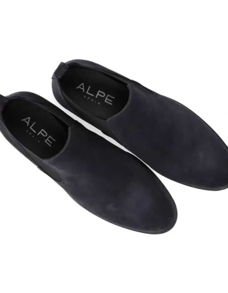 Botin Para Femme Alpe Parker, Fabricado En Piel (Baby Silk) De Color Marino Con Tacon De 6 Cm, Suela Antideslizante Y Puntera Redonda, Sin Cierre Y Cana Baja.