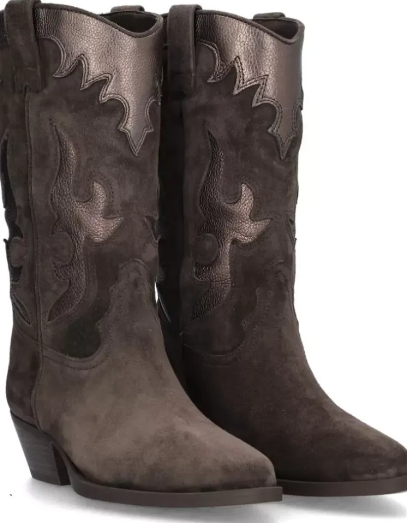 Bota Para Femme Alpe Western, Fabricada En Piel (Baby Silk) De Color Iman Con Tacon De 4,5 Cm, Suela Antideslizante Y Puntera Afilada, Sin Cierre Y Cana Media.