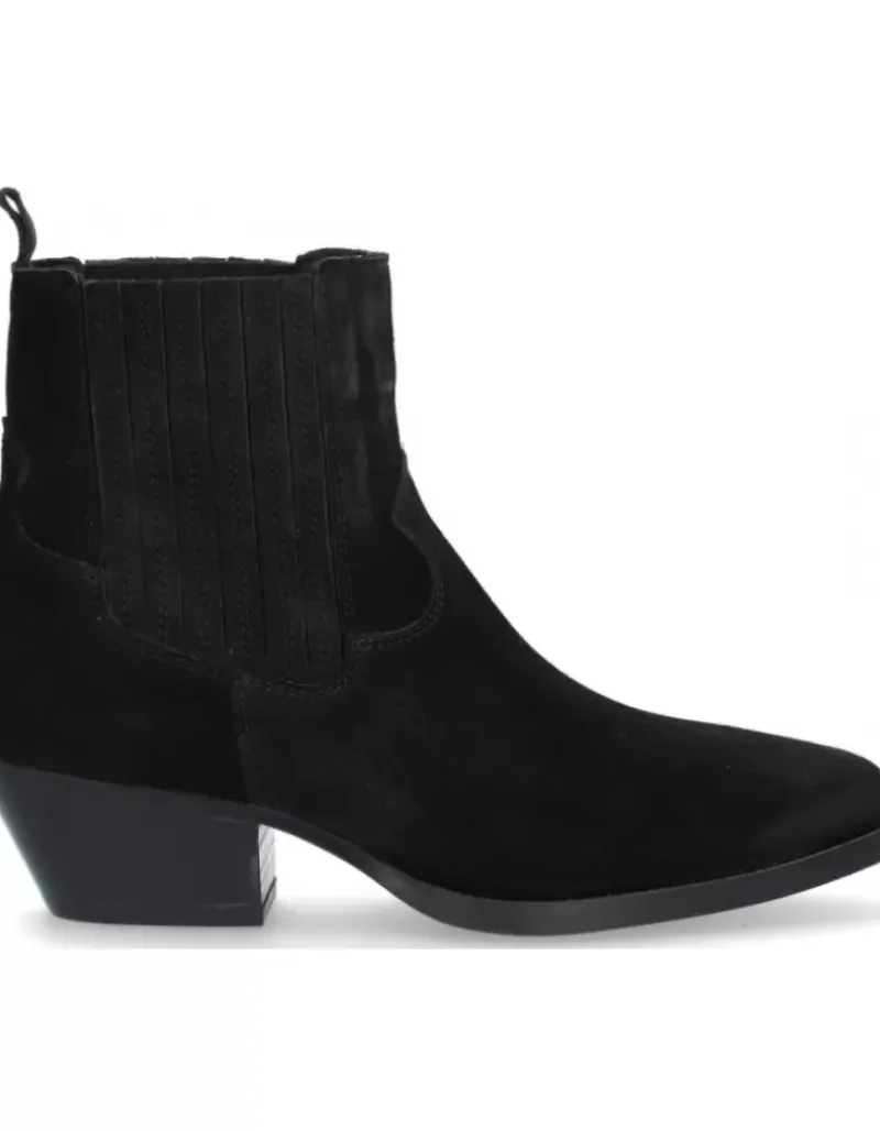 Botin Para Femme Alpe Western, Fabricado En Piel (Baby Silk) De Color Negro Con Tacon De 4,5 Cm, Suela Antideslizante Y Puntera Afilada, Sin Cierre Y Cana Baja.