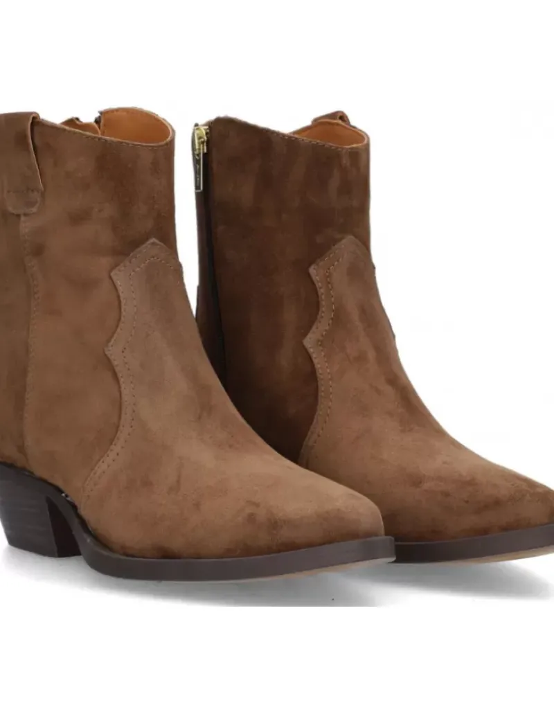 Botin Para Femme Alpe Western, Fabricado En Piel (Baby Silk) De Color Castaa Con Tacon De 4,5 Cm, Suela Antideslizante Y Puntera Afilada, Con Cierre Mediante Cremallera Y Cana Baja.